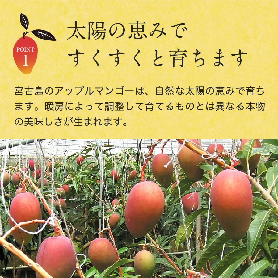 宮古島のアップルマンゴーは自然な太陽の恵みで育ちます。暖房によって調整して育てるものとは異なる本物の美味しさが生まれます。
