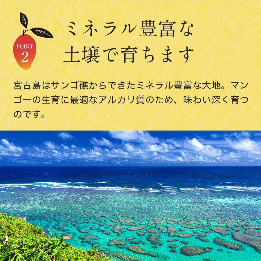 宮古島はサンゴ礁からできたミネラル豊富な大地。マンゴーの生育に最適なアルカリ質なため味わい深く 育つのです。